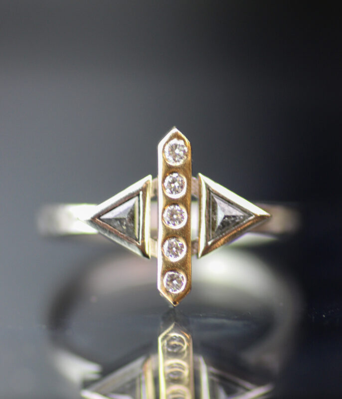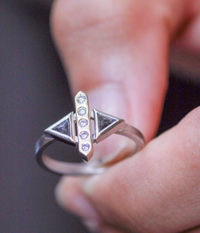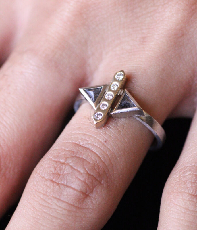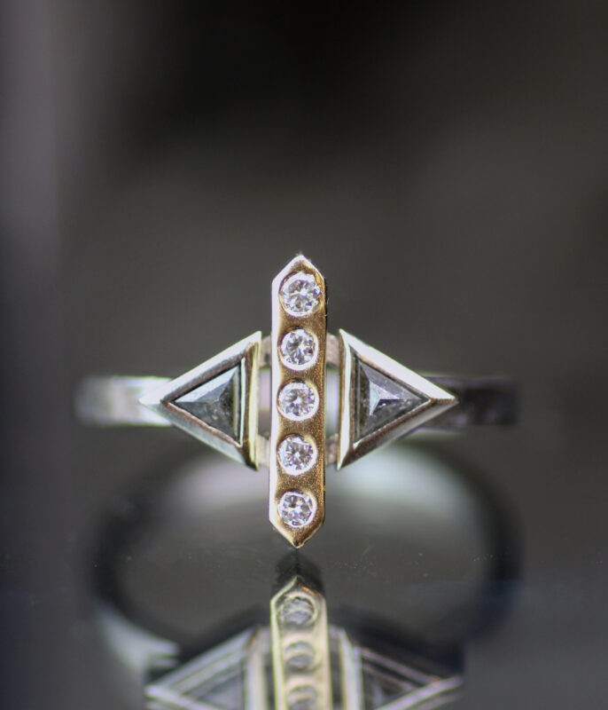 Auroric Mirror Double Triangle Salt and Pepper Diamond Gold Bar Engagement Ring