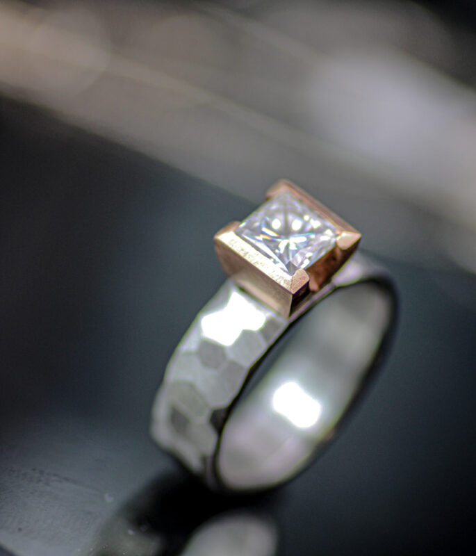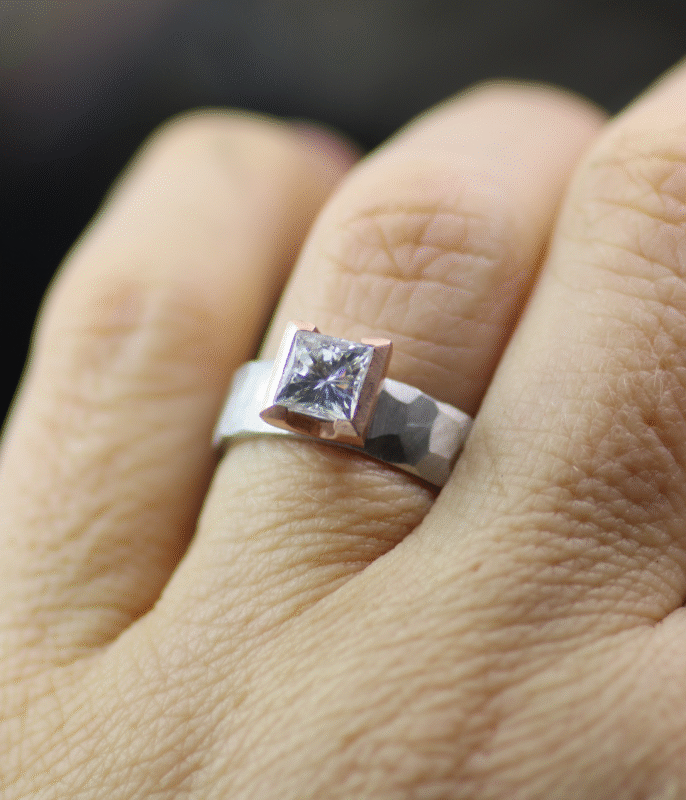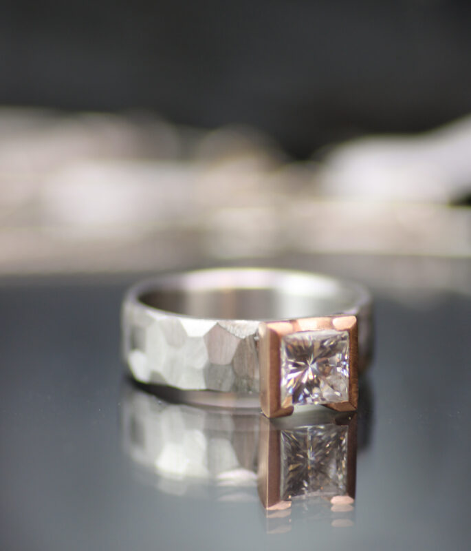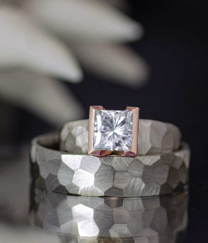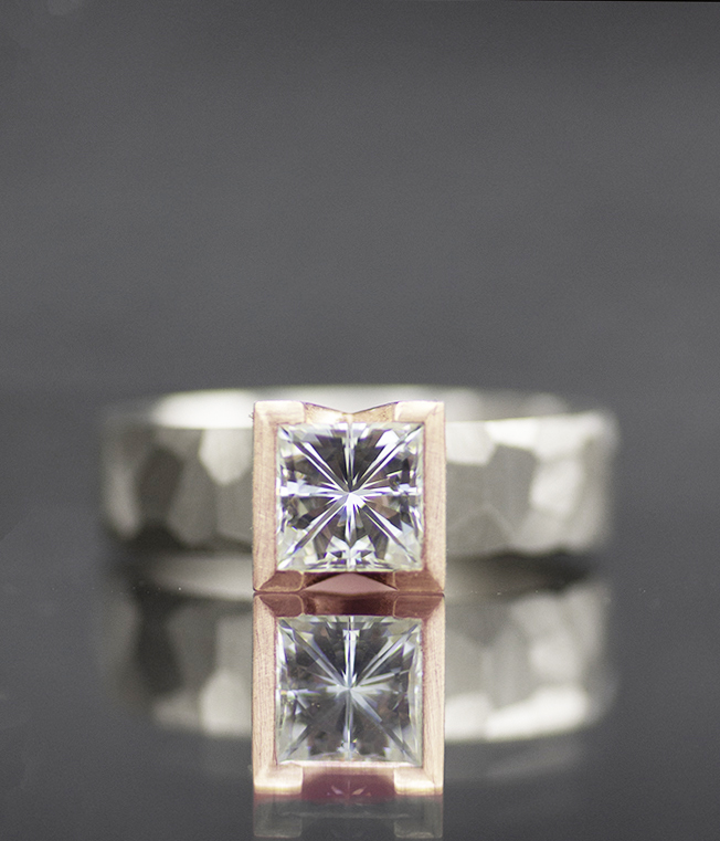 Ultra modern and architecturally minded, this ring uses a combination of organically arranged angles juxtaposed with rigid perpendicular lines. A square moissanite stone is set into a chunky half bezel which contrasts with the hand-faceted band. This ring is a testament to how beautifully these elements tie the design together.