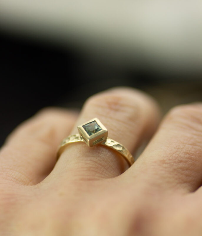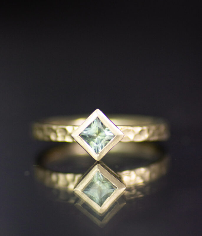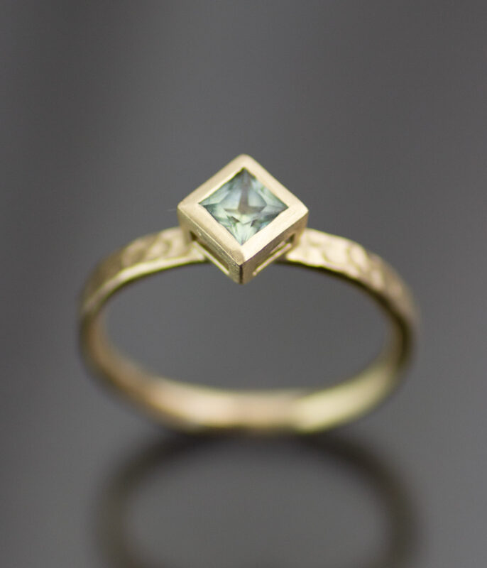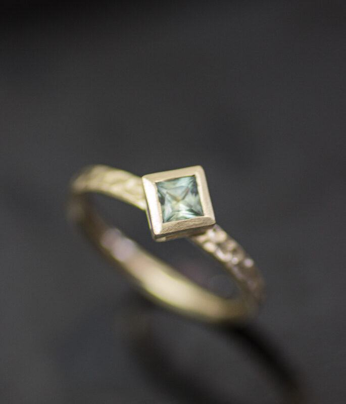 This ring is made from a cast that is textured by hand so no two are exactly alike. Set with a luminous, custom cut green Montana sapphire, this stone will be unique to you.