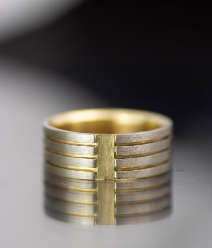Bold, clean lines and striking precious metals combine to create this stunning, modern, wedding band you will not find anywhere else.