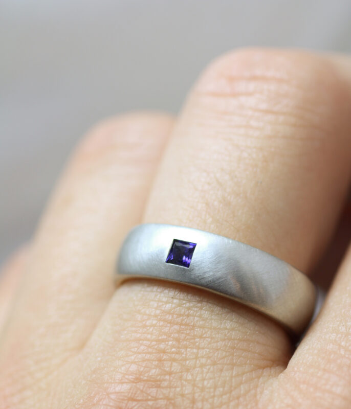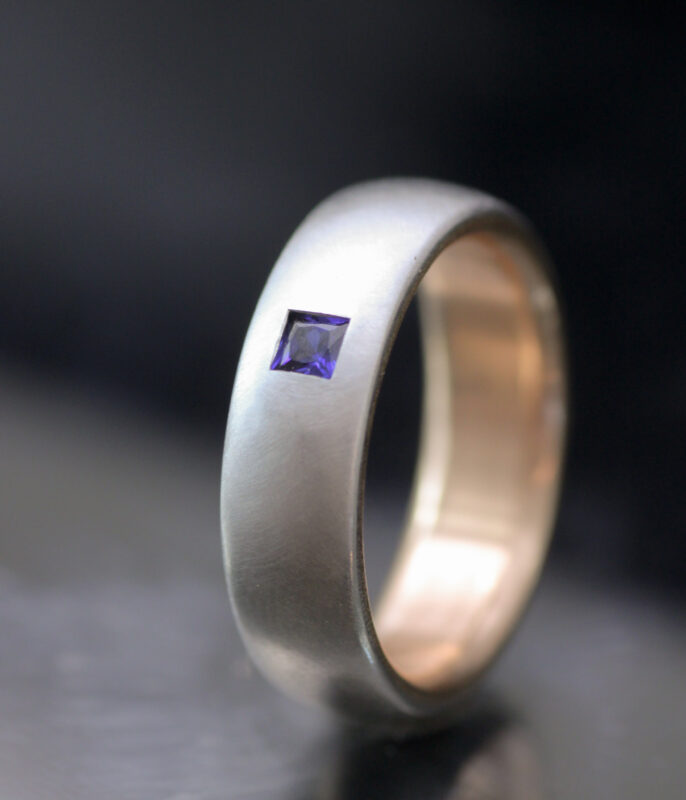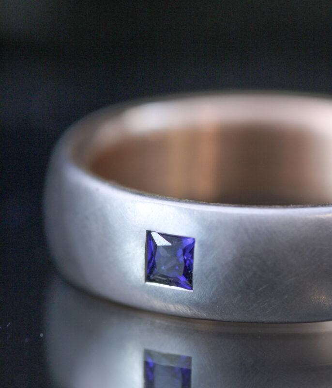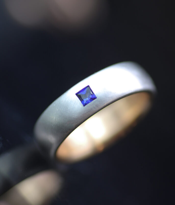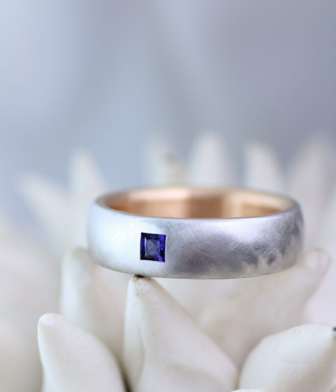 There’s just a sliver of the contrasting color peeking through the edges, but you’ll know it’s there. A genuine lab-grown sapphire sits perfectly flush with the curve, creating contrast between the sharp facets of the stone and the soft curves of the band.
