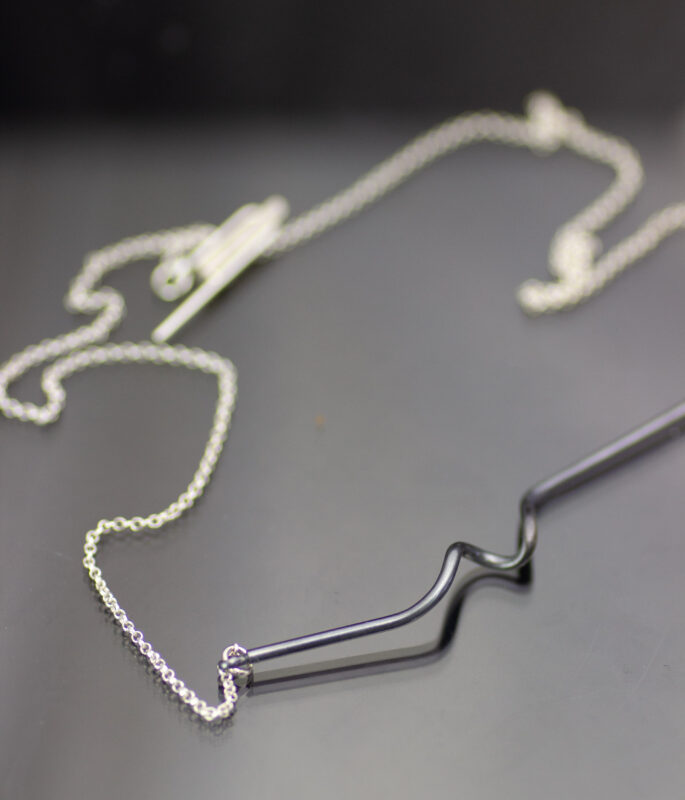 The oxidized sterling silver “pendant” is burnished to a soft luster, but the finish can change over time with wear. Sterling silver chain and handmade clasp.