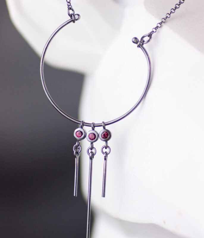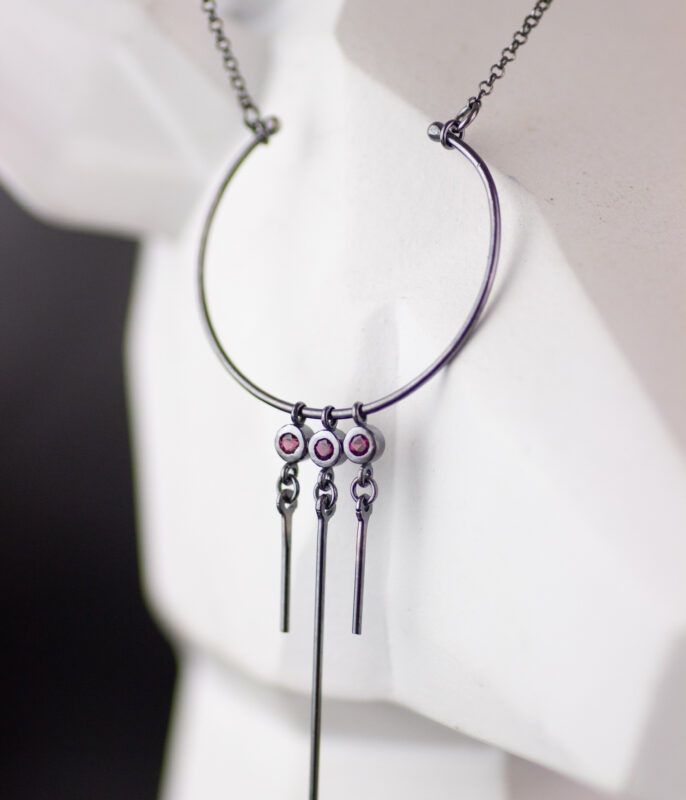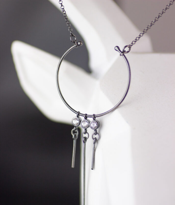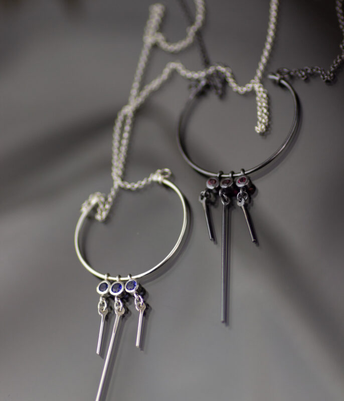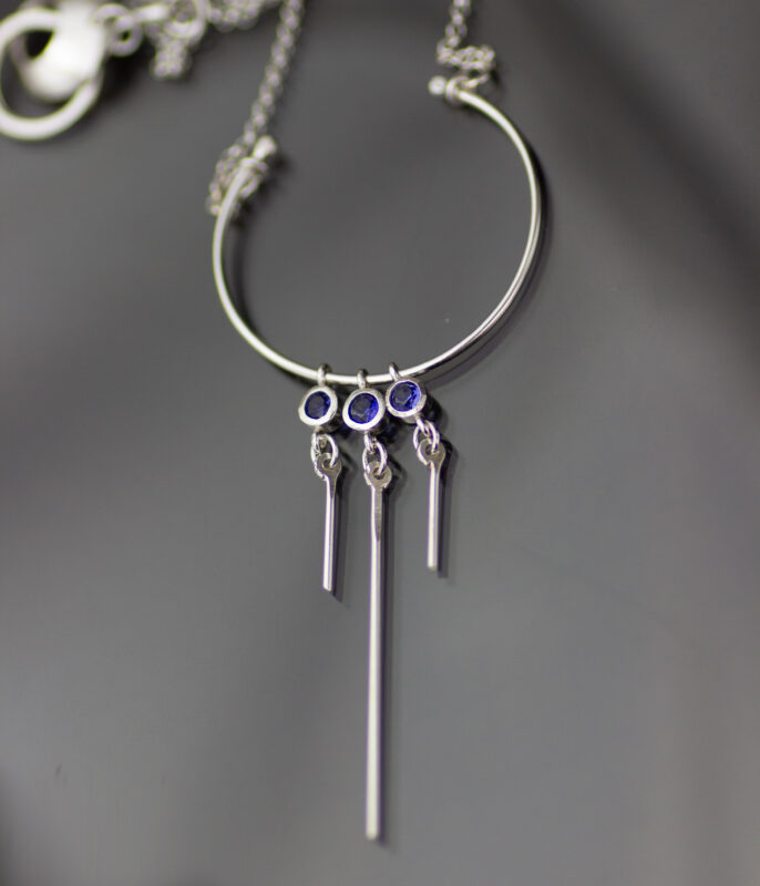 A simply stunning minimalist piece made from .925 sterling silver. A triplet of your choice of blue, white or berry sapphires, bezel set and finished to complement and emphasize the subtle sparkle of the stone. A modern, dynamic, and elegant necklace with several moving parts.